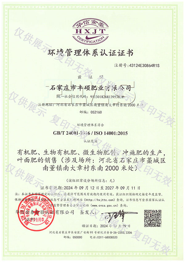 +更多石家莊市豐碩肥業(yè)有限公司是一家集新型肥料的研發(fā)、制造、營(yíng)銷(xiāo)、服務(wù)于一體的高新技術(shù)企業(yè),公司自2008年創(chuàng)辦以來(lái),一直致力于新型肥料的技術(shù)研發(fā)和市場(chǎng)推廣。公司組建了豐碩新型肥料研究中心(院士專(zhuān)家企業(yè)工作站),自主知識(shí)產(chǎn)權(quán)研發(fā)團(tuán)隊(duì)專(zhuān)業(yè)科研人員20余人,獲得了多項(xiàng)肥料國(guó)家發(fā)明專(zhuān)利。公司目前已擁有發(fā)酵類(lèi)有機(jī)肥、微生物菌劑、生物有機(jī)肥、土壤調(diào)理劑、大量元素水溶肥、含腐植酸肥料、含氨基酸肥料、中微量元素肥料等8大品類(lèi),“金維克”、“豐碩沃農(nóng)”等2大自有品牌,擁有20多個(gè)暢銷(xiāo)品種。目前,我公司已經(jīng)通過(guò)了“ISO9001 質(zhì)量管理體系認(rèn)證”、“ISO14001 環(huán)境管理體系認(rèn)證”、“OHSAS18001 職業(yè)健康管理體系認(rèn)證”。...